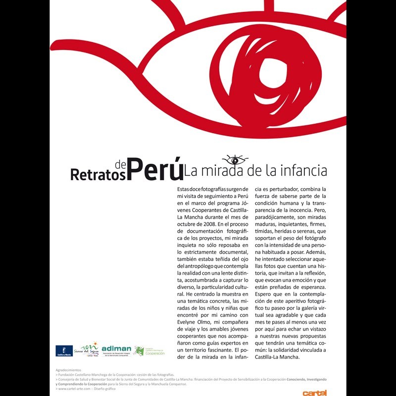 Estas doce fotografías surgen de mi visita de seguimiento a Perú en el marco del programa Jóvenes Cooperantes de Castilla- La Mancha durante el mes de octubre de 2008. En el proceso de documentación fotográfica de los proyectos, mi mirada inquieta no sólo reposaba en lo estrictamente documental, también estaba teñida del ojo del antropólogo que contempla la realidad con una lente distinta, acostumbrada a capturar lo diverso, la particularidad cultural. He centrado la muestra en una temática concreta, las miradas de los niños y niñas que encontré por mi camino con Evelyne Olmo, mi compañera de viaje y los amables jóvenes cooperantes que nos acompañaron como guías expertos en un territorio fascinante. El poder de la mirada en la infancia es perturbador, combina la fuerza de saberse parte de la condición humana y la transparencia de la inocencia. Pero, paradójicamente, son miradas maduras, inquietantes, firmes, tímidas, heridas o serenas...